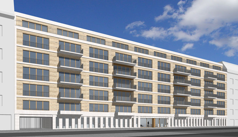 Neubau eines hochwertigen Geschosswohnungsbaus in Berliner-Innenstadtlage mit EG + 6 Obergeschossen und 2 Untergeschossen. 16 Wohnungen (ca. 200 - 400 m²), davon 8 Maisonettwohnungen (im Erdgeschoss mit Garten und im Dachgeschoss mit Terrassen). Alle Wohnungen mit großzügigen Balkonen, jeweils 2 - 4 Bädern sowie Gäste-WC, raumhohe faltbare Fensteranlagen an den Wohnräumen, "durchgesteckte" Wohnbereiche mit Loftcharakter, aber auch unterteilbar. 31 Tiefgaragenplätze. Hauseingangsbereich mit Concierge als Servicestation geplant. Fassade in Langziegel mit Sichtbetonbändern gegliedert.